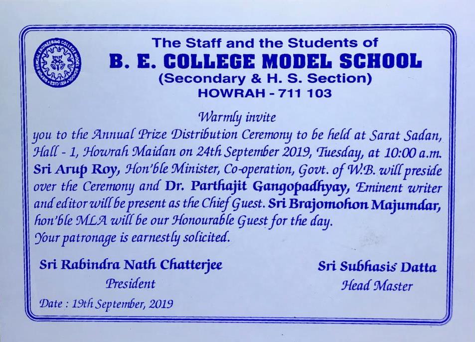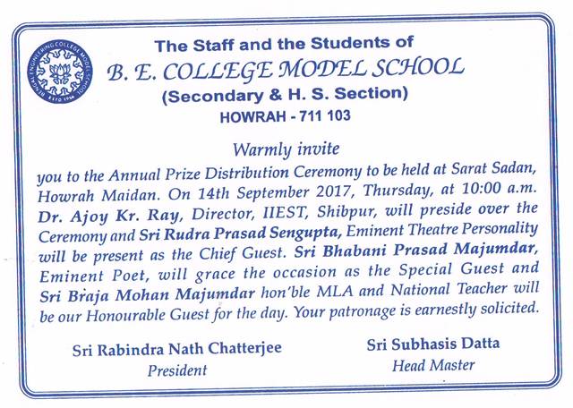 Warmly Invite you to the Annual Prize distribution Ceremony to be held at Sarat Sadan, Howrah Maidan. 09/09/2017Headmaster Download