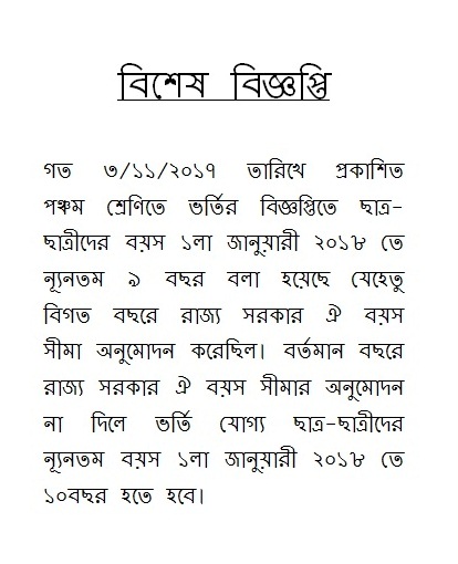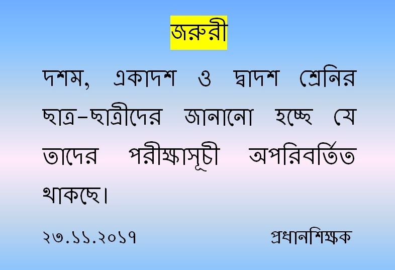 The classes will remain suspended until further order by the W.B.B.S.E (Govt. of WB ).But the guardians of class IX & X (Nine & Ten) are requested to attend a urgent meeting on 30.04.16 at 11 A.M. at school premises. 28/04/2016Head Master Download