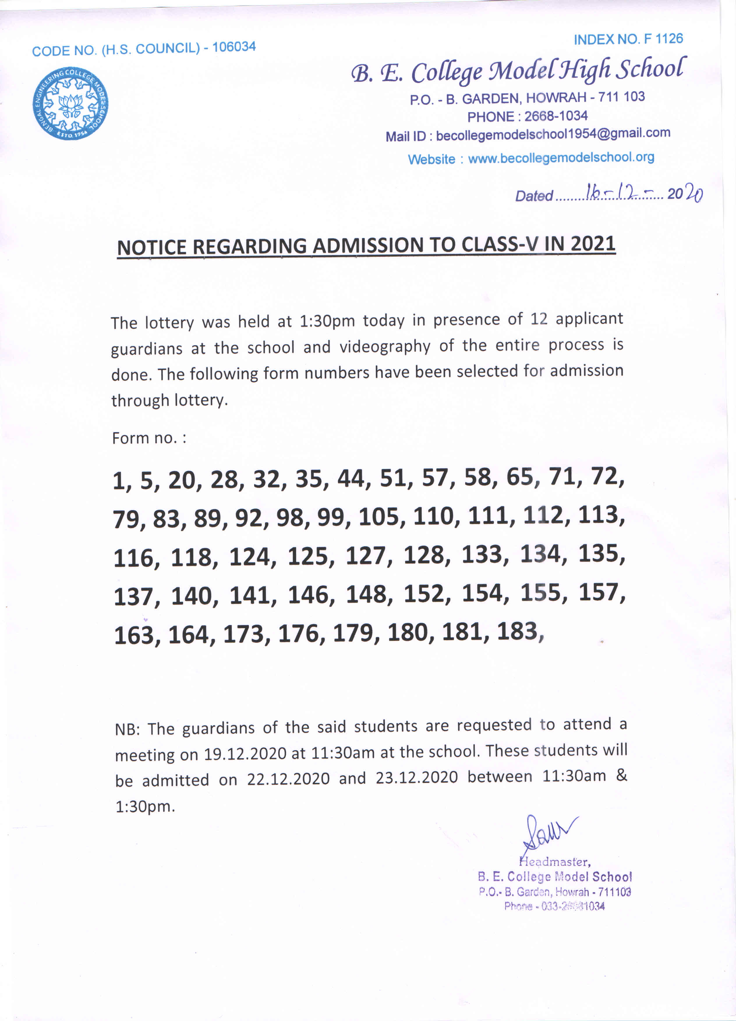 NOTICE FOR ADMISSION TO CLASS XI 10/05/2016HeadMaster Download