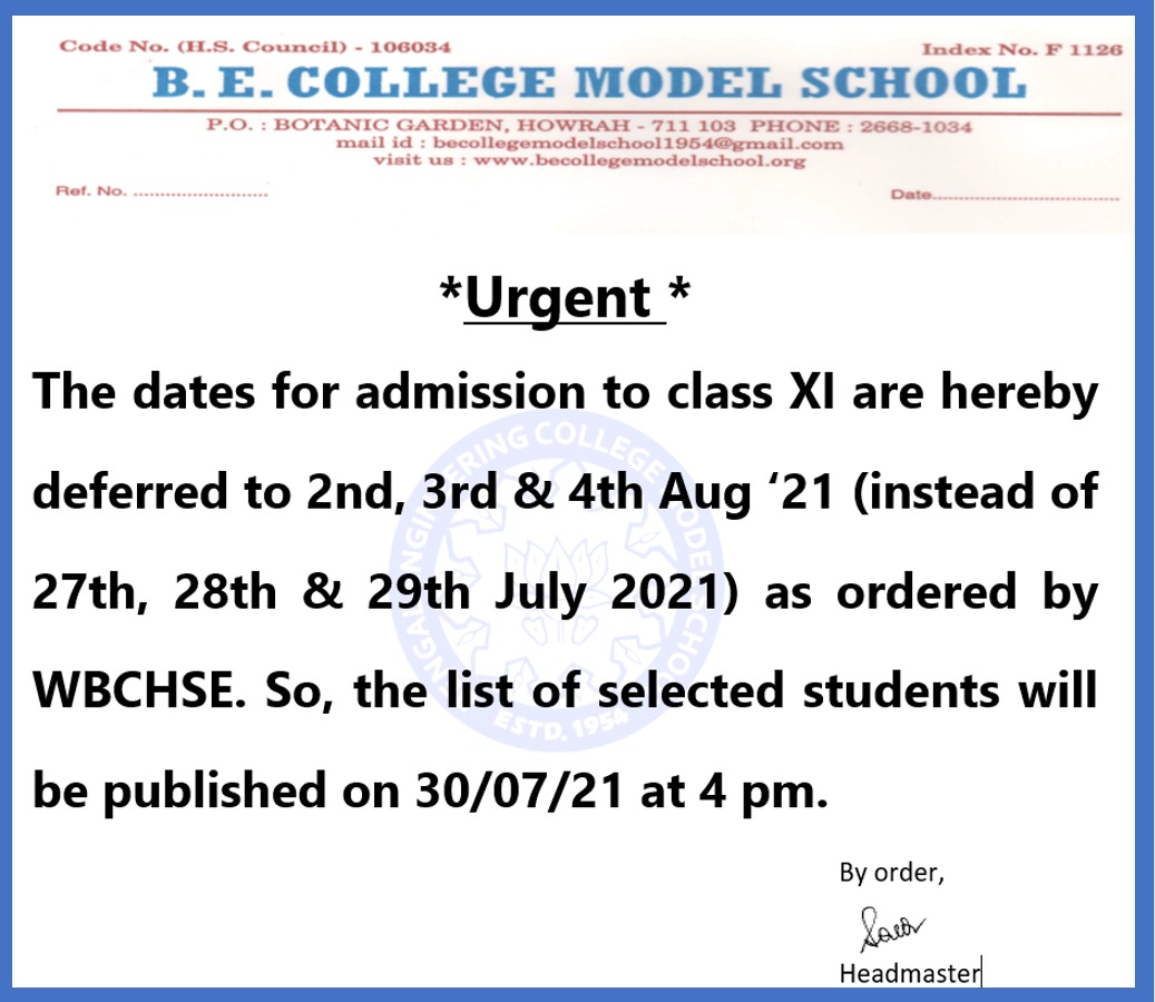 Please find the attached order of WBCHSE in which it is evident that the students of B.E.C.M.S will appear /seat at “B.Garden Chittaranjan Adarha Vidyamandir” in the Higher Secondary Examination 2019.